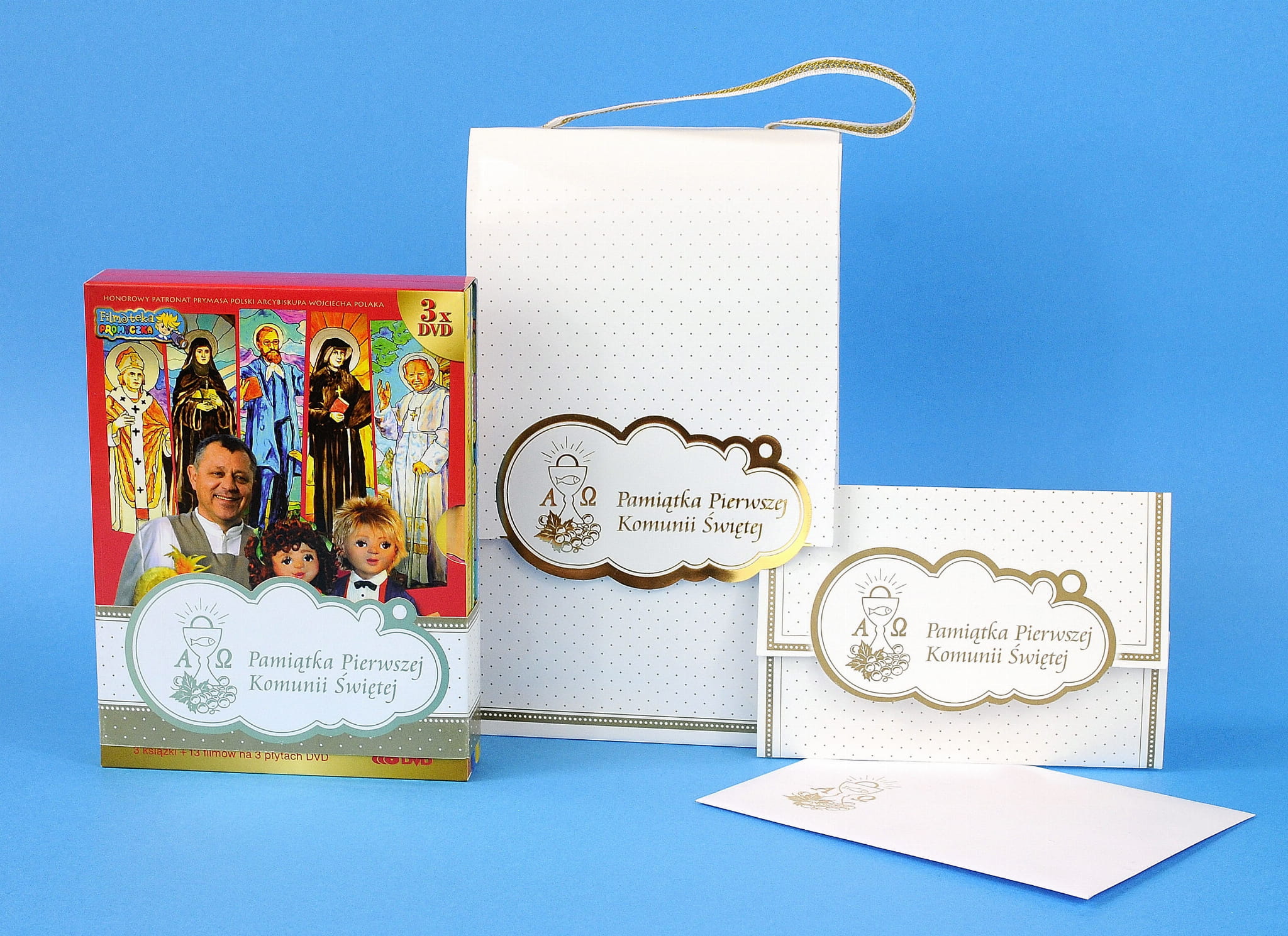 Zestaw komunijny zawiera album 3xDVD Aureola - Od Stanisława do Karola z okazjonalną obwolutą, elegancką torebkę i kopertę z życzeniami (Pamiątką Pierwszej Komunii Świętej).