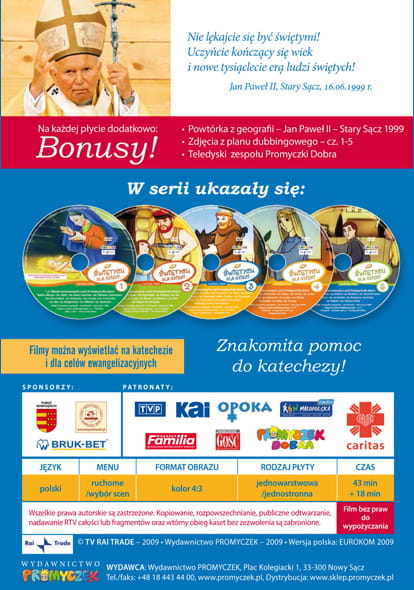 W praktycznym i eleganckim albumie zamieszczono 5 płyt DVD z aż 60-cioma animowanymi filmami o najbardziej znanych świętych (zob. spis). Filmy zostały zrealizowane przez włoską Telewizję RAI TRADE, natomiast nad wersją polską pracowało studio EUROCOM. Przy dubbingach współpracowało ponad 30 znakomitych aktorów, a w rolę narratora wcielił się Piotr Fronczewski.